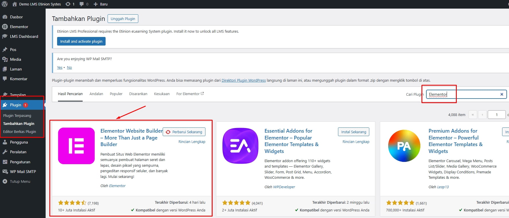 Buka WP Admin, Plugin > Tambah Baru > search Elementor, kemudian Instal dan Aktifkan